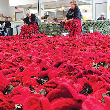 More than 40 volunteers have been meet-ing at the Legion to attach the poppies to two large cargo nets. Fortier estimates they will need to meet again in a week or so to finish the job.